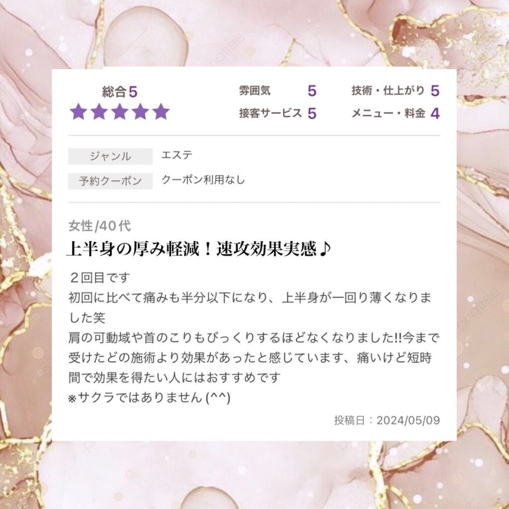 「ダイエット目的で通い始めたが、首や肩のコリも同時に気になっていた。担当から毎回丁寧な説明があり、施術中の痛みもリラックスして相談できた。今では脚や肩、背中の色もキレイになり、体つき全体が変わった。」