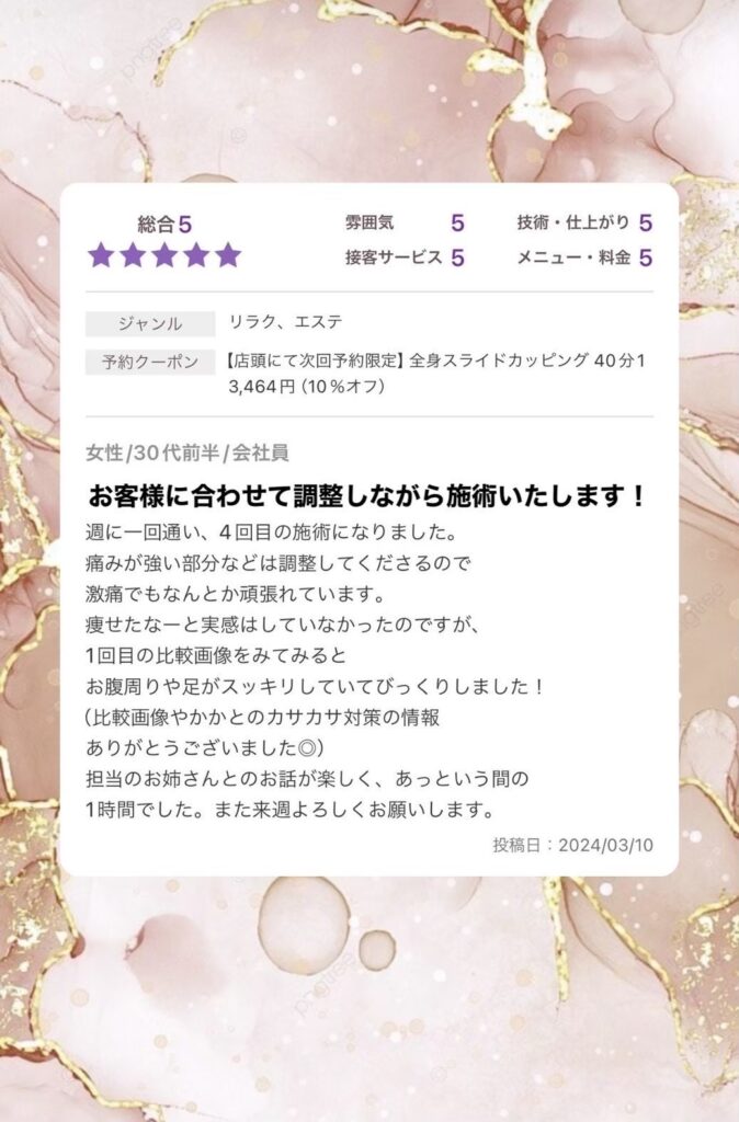 「カッピング後は若干赤くなりますが、数時間から1〜2日で消えます」とのこと。痛みを乗り越えて変化を得たい方には、じつは安心材料となっています。