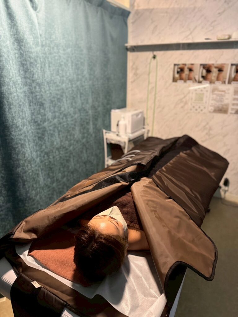 施術前に遠赤外線ヒートマットで身体を芯から温めることで、固まった脂肪が溶けやすくなり、カッピングの効果が高まります。