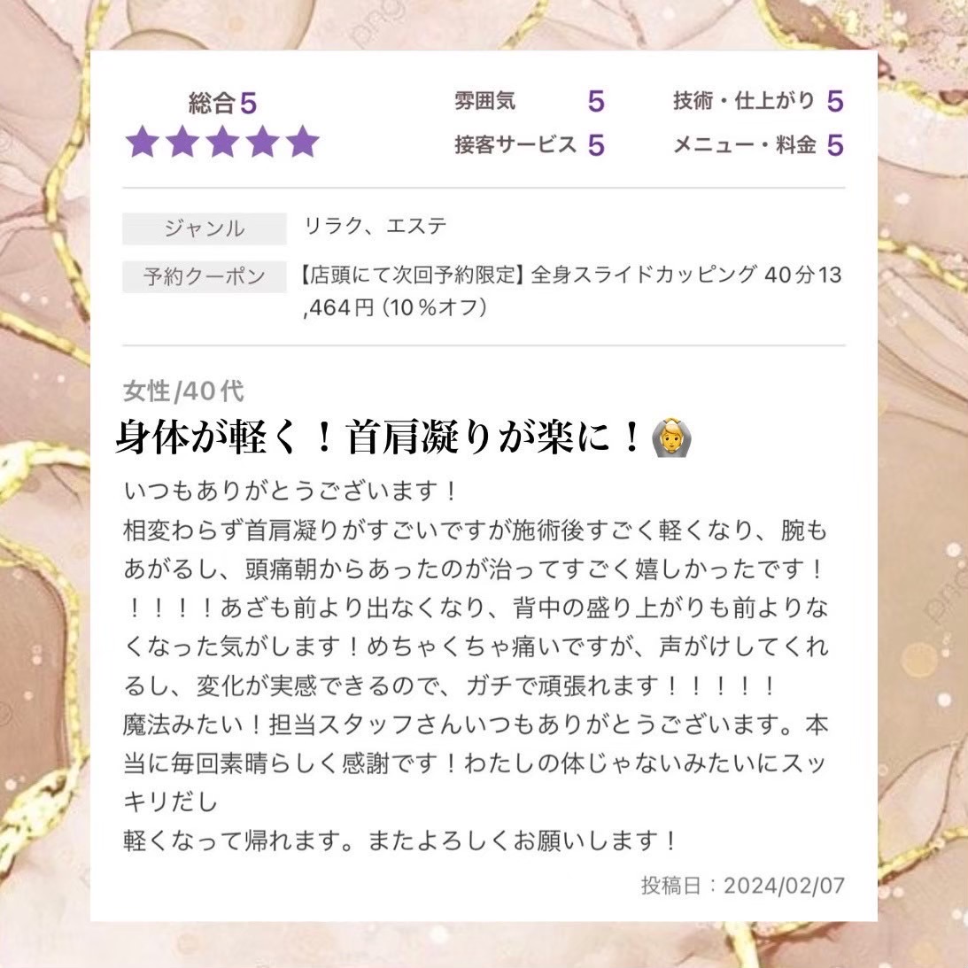 何年も蓄積されたコリと痛み。整体を転々としても改善しなかった症状が、カッピングによって大きく変化したのです。